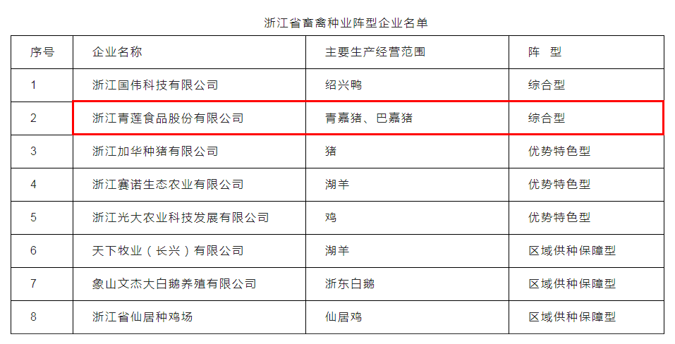 9月14日,浙江省農(nóng)業(yè)農(nóng)村廳、浙江省科學(xué)技術(shù)廳公布了浙江省種業(yè)陣型企業(yè)名單,其中浙江青蓮食品股份有限公司被認(rèn)定為省畜禽種業(yè)綜合性陣型企業(yè)。